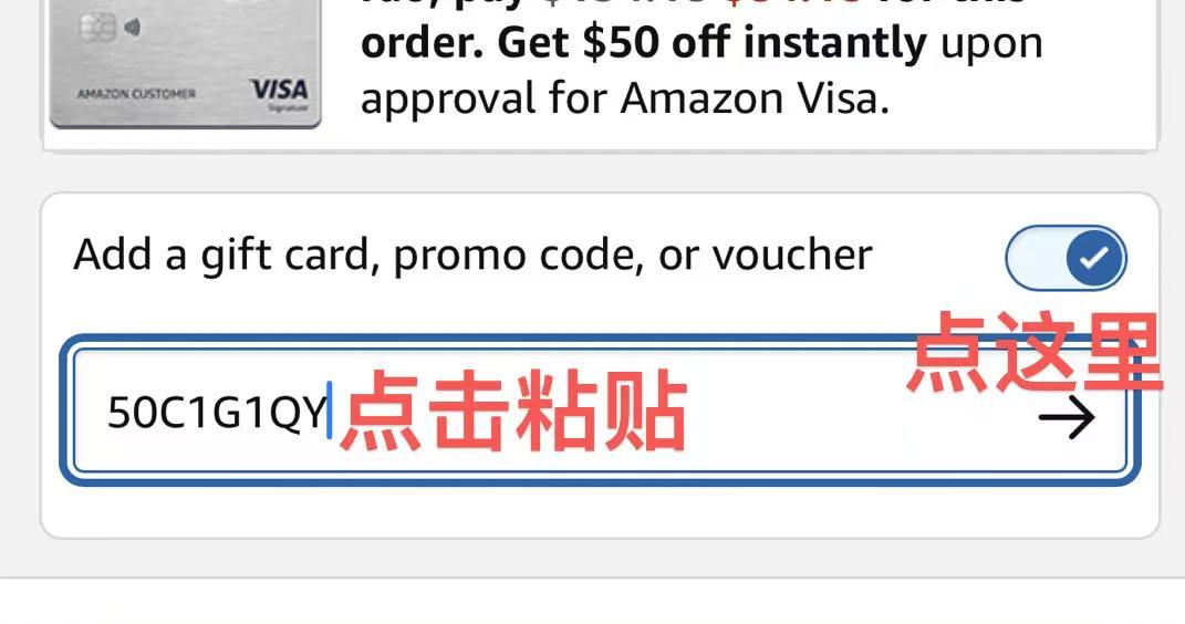第三步:点击输入礼品卡折扣码的旁边,把小圆形 “—” 按钮变成 “√” 然后就可以粘贴刚刚复制的折扣码。再点击旁边的 “→” 符号或者是 “apply” 按钮,就会激活折扣码。这步有些账号是 “→” 符号有些是 “apply” 按钮,但是一定要记住点击才会激活。
