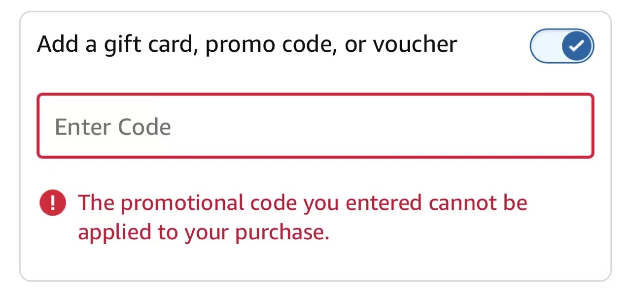 如果在输入折扣码点击旁边的 “→” 符号或者 “apply” 按钮之后出现 “The promotional code you entered cannot be applied to your purchase”,那就是说明这个折扣码不能用于这个颜色或者尺码,商家设置了只能指定的一些颜色或者尺码可以激活此折扣码。